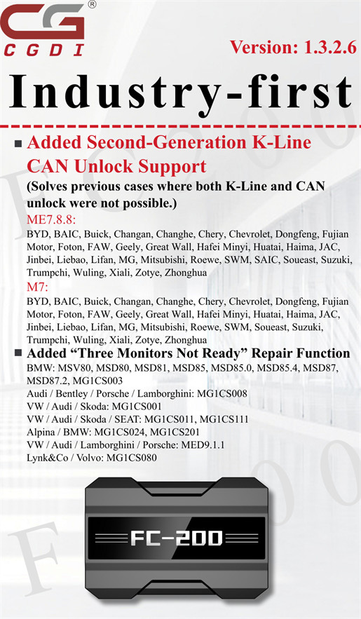 We are pleased to announce the release of CG FC200 software version 1.3.2.6. This update introduces groundbreaking support for Second-Generation K-Line CAN Unlock for ME7.8.8 and M7 ECUs—an industry-first innovation—effectively resolving previously unsupported cases where neither K-Line nor CAN unlock was possible.