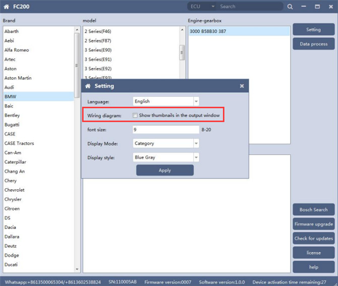 That’s a function in the “Settings” of the CG FC200 software. When we tick this option ‘Show thumbnails in the output window’, the operation interface will display the thumbnail of the ECU wiring diagram, and vice versa.