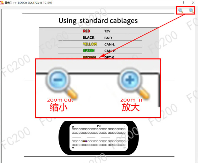 The size and position of the wiring diagram of the ECU are not fixed. In order to facilitate viewing, there are two ways to zoom in and out in CG FC200 software.