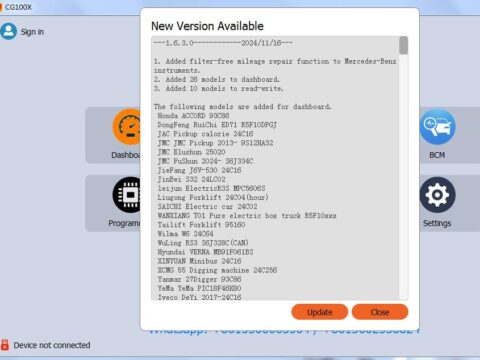 CGDI CG100X Programmer New Version V1.6.3.0 Update on Nov. 16th, 2024: Added filter-free mileage repair function to Mercedes-Benz instruments with…