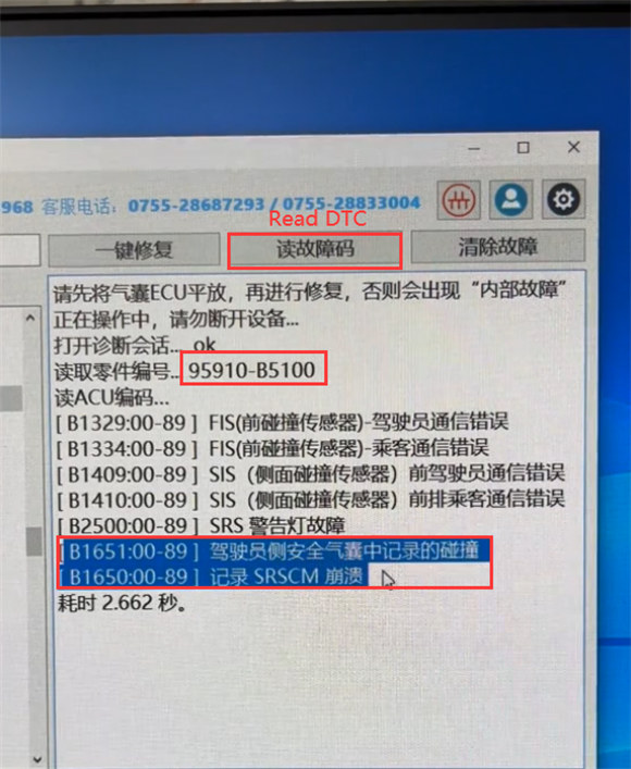 Click Read DTC to read out the ECU part number (95910-B5100) and two fault codes (B1651:00-89, B1650:00-89)