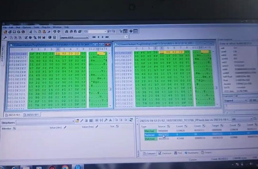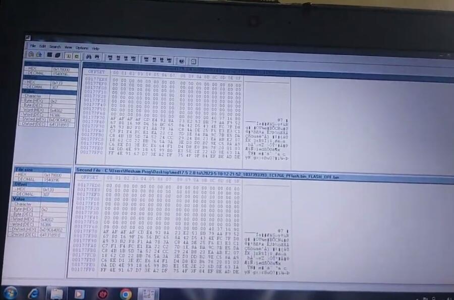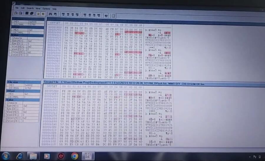 Use HexCmp software to compare the original DFlash data and DFlash IMMO checksum data, PFlash data and PFlash IMMO data, there are some differences in DFlash data, but it’s hard to see the difference on the Pflash files because only two little parts are changed.