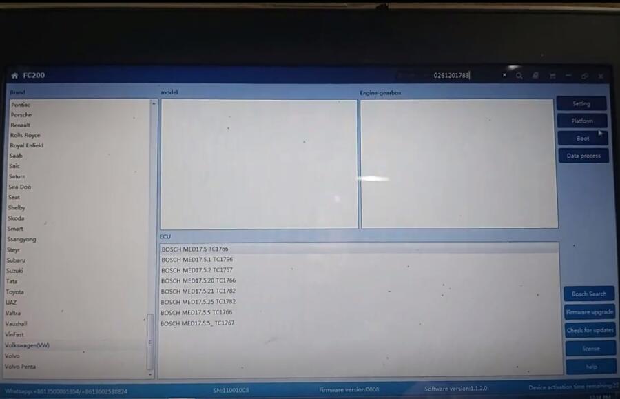 Run FC200 software, select Volkswagen (VW)>> BOSCH MED17.5 TC1766>> Platform