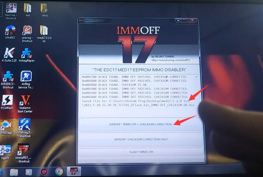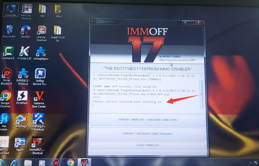 After opening IMMOFF17 software, click “EEPROM + IMMO OFF + CHECKSUM CORRECTION”