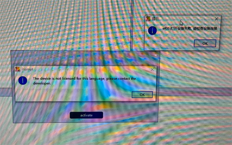One customer updated his CG FC200 software and got the error message “ef01: open device failure” and “The device is not licensed for this language…” as shown in the figures below.
